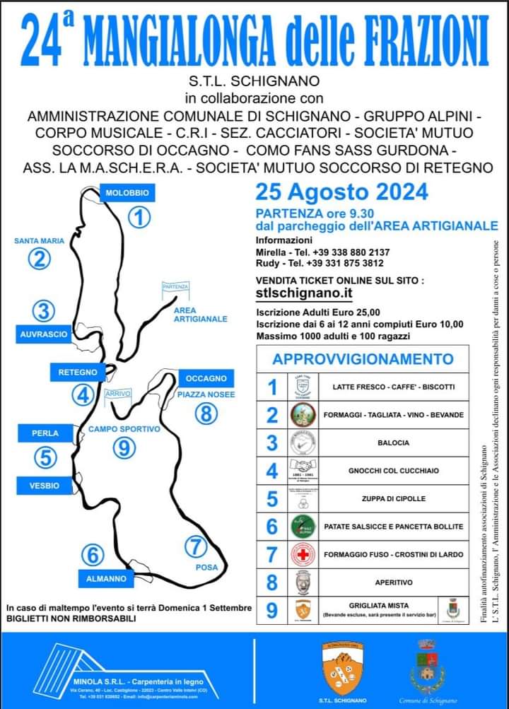 The Mangialonga, an eagerly awaited food and wine event, will be held on Sunday, August 25 in the charming town of Schignano. This event offers participants an unforgettable experience among the hamlets of the town and the delicacies of traditional cuisine.