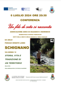 Sabato 6 luglio, a partire dalle 20.30, nel Salone dell’ex Asilo Infantile – Peduzzi Donato Lanee, Via Nusee 12, Schignano, La conferenza, intitolata “Un filo di seta si racconta”, è organizzata dall’Associazione Amici di Dizzasco e Muronico e sarà moderata da Stefania Pedrazzani.