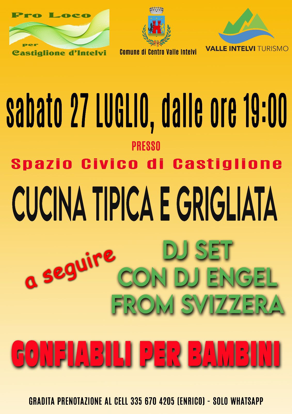 È festa a Castiglione Intelvi sabato 27 luglio. Si balla, si cena e ci si diverte. Allo Spazio civico della frazione di Centro Valle Intelvi, a partire dalle 19.00, si griglia. La serata sarà animata dal dj Engel from Svizzera. Per i più piccoli, divertimento assicurato con i gonfiabili.